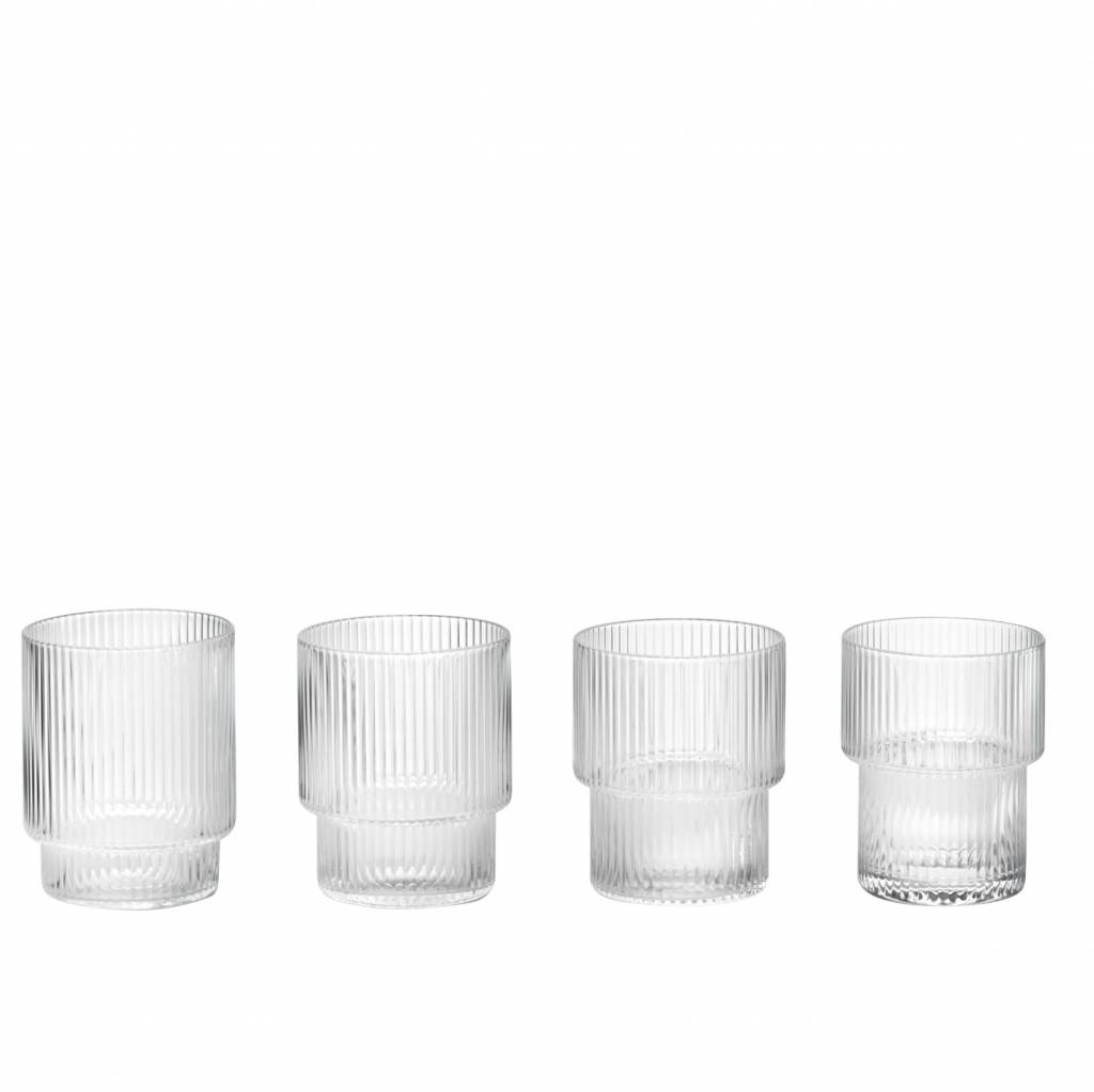 Dette sæt af fire mundblæst glas er kendetegnet ved en fin rillet overflade. De lodrette aksler tilbyde en høj kvalitet udseende og de geometriske former giver dynamik mellem glassene. weitere Informationen...