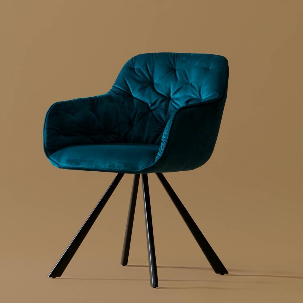 Der Esszimmerstuhl Elaine ist in den Farben Anthrazit, Tiefsee und Ozean erhältlich. Es ist auch ein Elaine Fauteuil erhältlich. Der Fauteuil ist nur mit dem Samtstoff in der Farbe Anthrazit erhältlich.