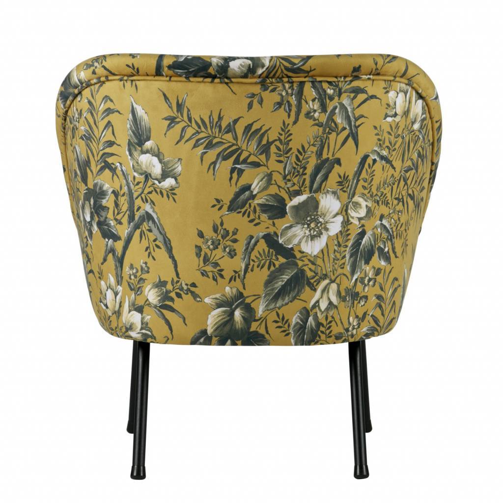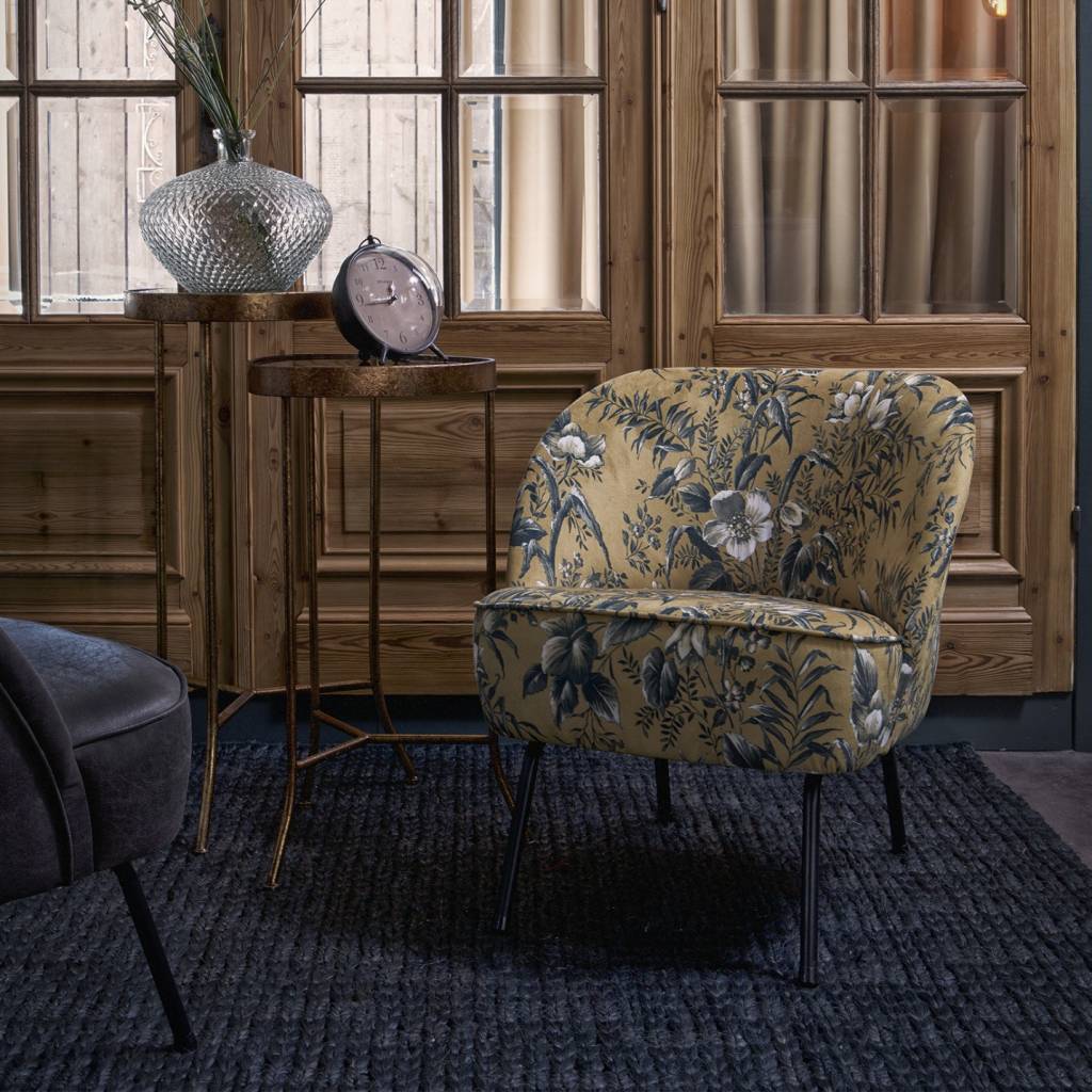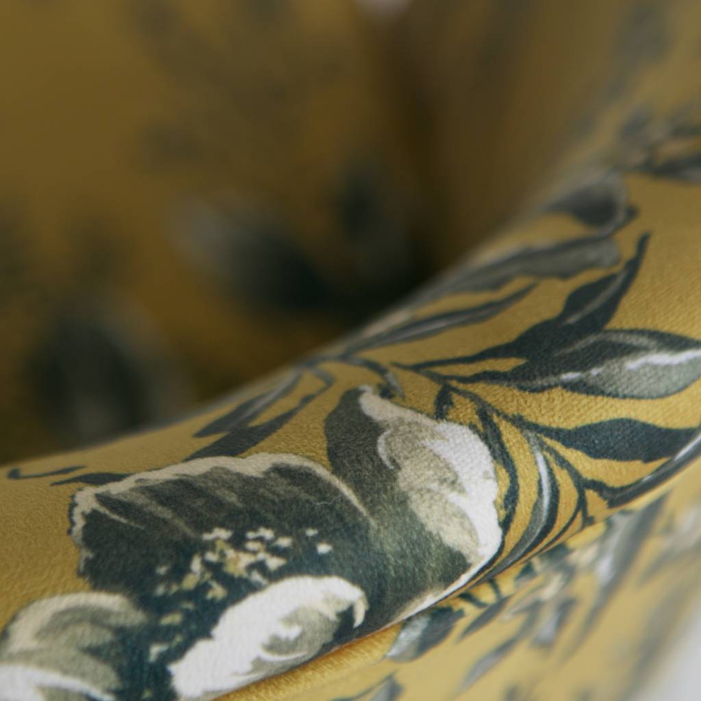 Der Vogue-Fauteuil ist mit einem wunderschönen und reichhaltigen Samtstoff mit Mohndruck (100%PES) ausgestattet. Dieser Samtstoff ist in den Farben Grau und Senf erhältlich. Die Beine sind aus Metall, welche schwarz lackiert sind.