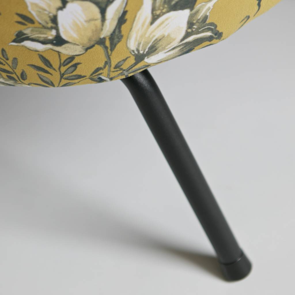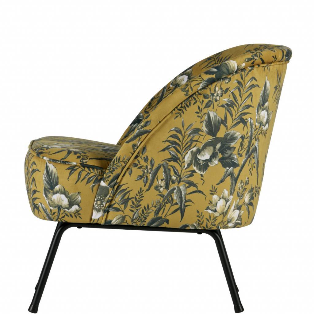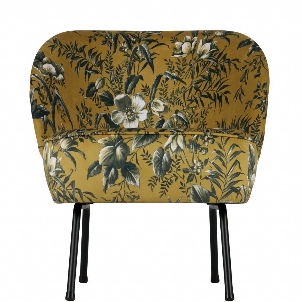 Der Vogue-Fauteuil ist mit einem wunderschönen und reichhaltigen Samtstoff mit Mohndruck (100%PES) ausgestattet. Dieser Samtstoff ist in den Farben Grau und Senf erhältlich. Die Beine sind aus Metall, welche schwarz lackiert sind.