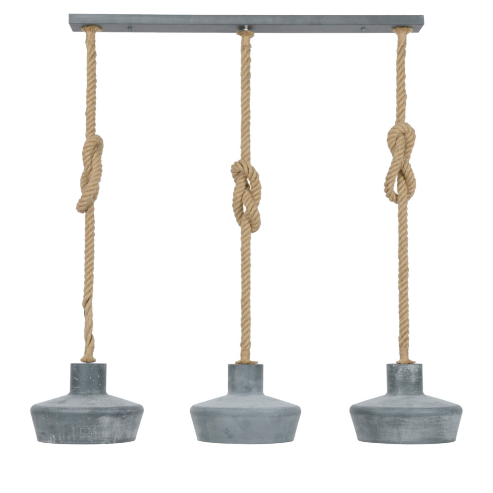 Diese Hängelampe ist ein einzigartiges Beispiel. Durch die Kombination aus Betonoptik und robusten Seilen ist dies ein echter Gewinn. Die drei Kappen hängen an Seilen, die an einer metallgrauen Deckenkappe befestigt sind. weitere Informationen...