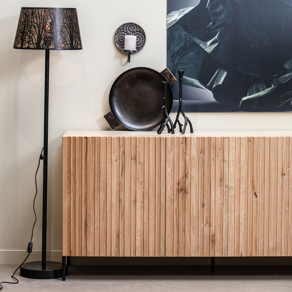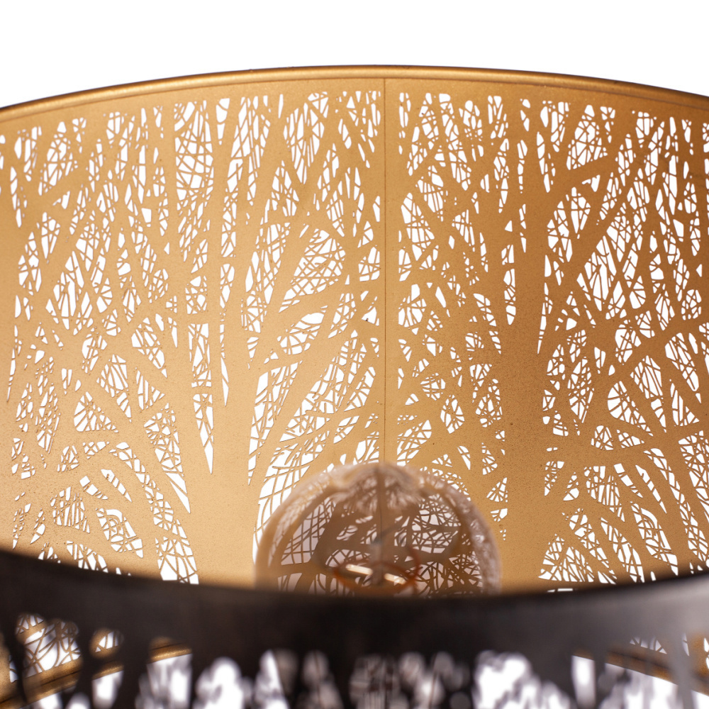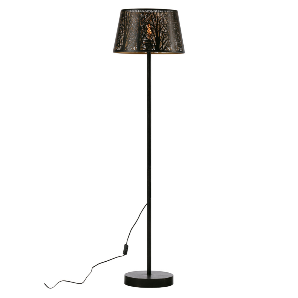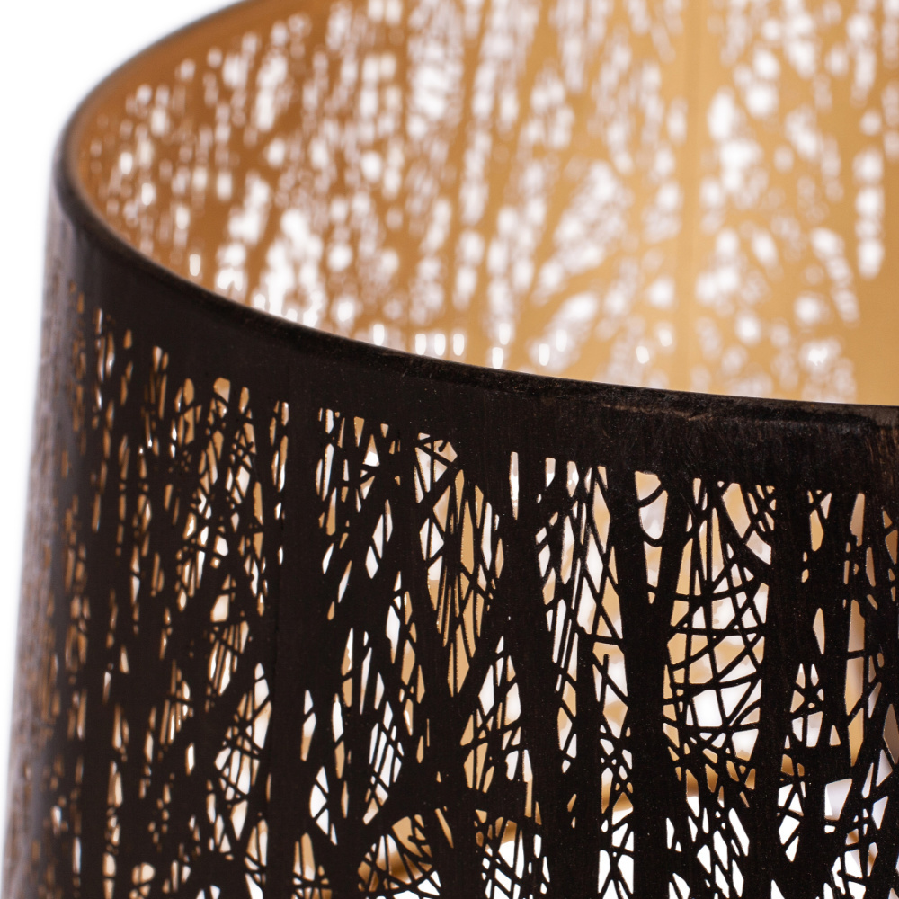 Keto is a metal floor lamp with a beautiful golden interior. The shade features a cut-out branch pattern that diffuses the light in the lampshade, giving it a playful glow! Also available as a table lamp. weitere Informationen...