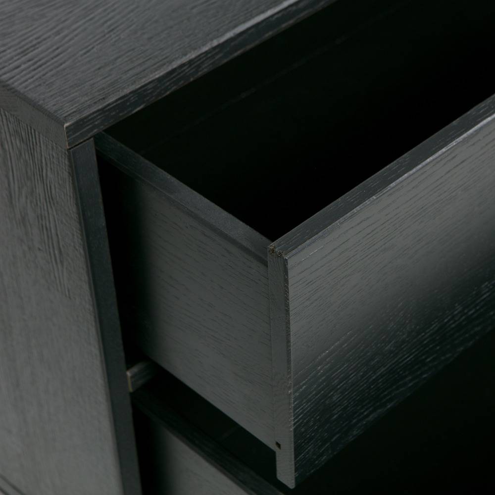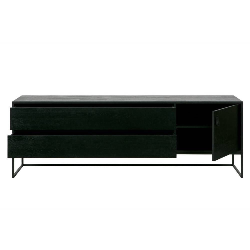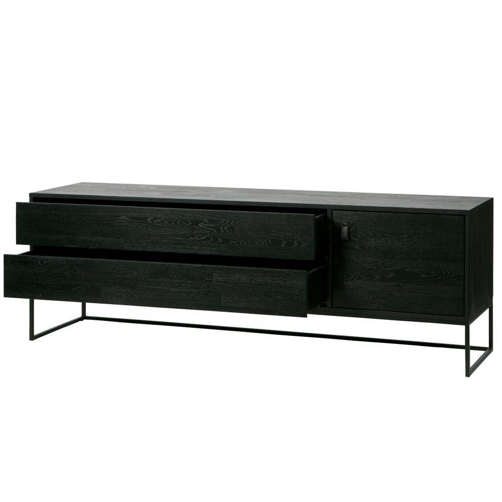 WOOOD Silas TV Furniture [FSC] tiene un aspecto moderno y ofrece un espacio elegante para su TV. Los muebles de Silas TV están hechos de roble cepillado, que están pintados en el color blacknight. La madera cepillada ha acentuado el grano de madera y una superficie desigual. Las patas (H: 20 cm) y los soportes están hechos de metal y pintados de negro.