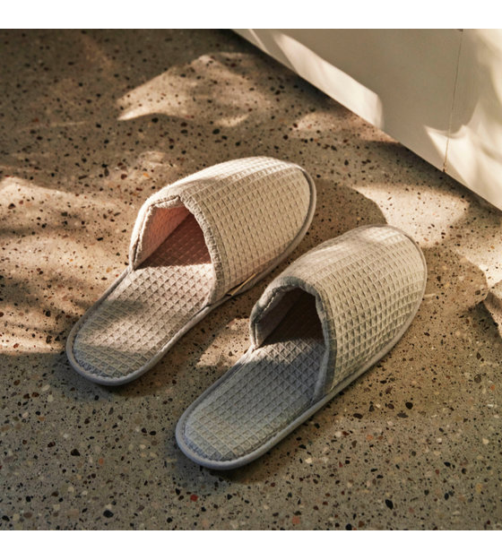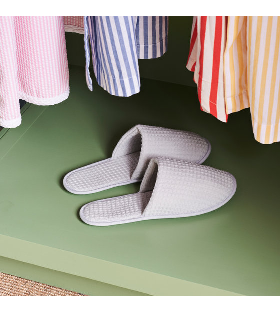 Los zapatos de gofres de Hay están hechos de algodón suave y absorbente con una estructura de gofres tridimensional. Tienen suela de goma antideslizante y están disponibles en talla única. ¡Agradable combinar con el albornoz! weitere Informationen...
