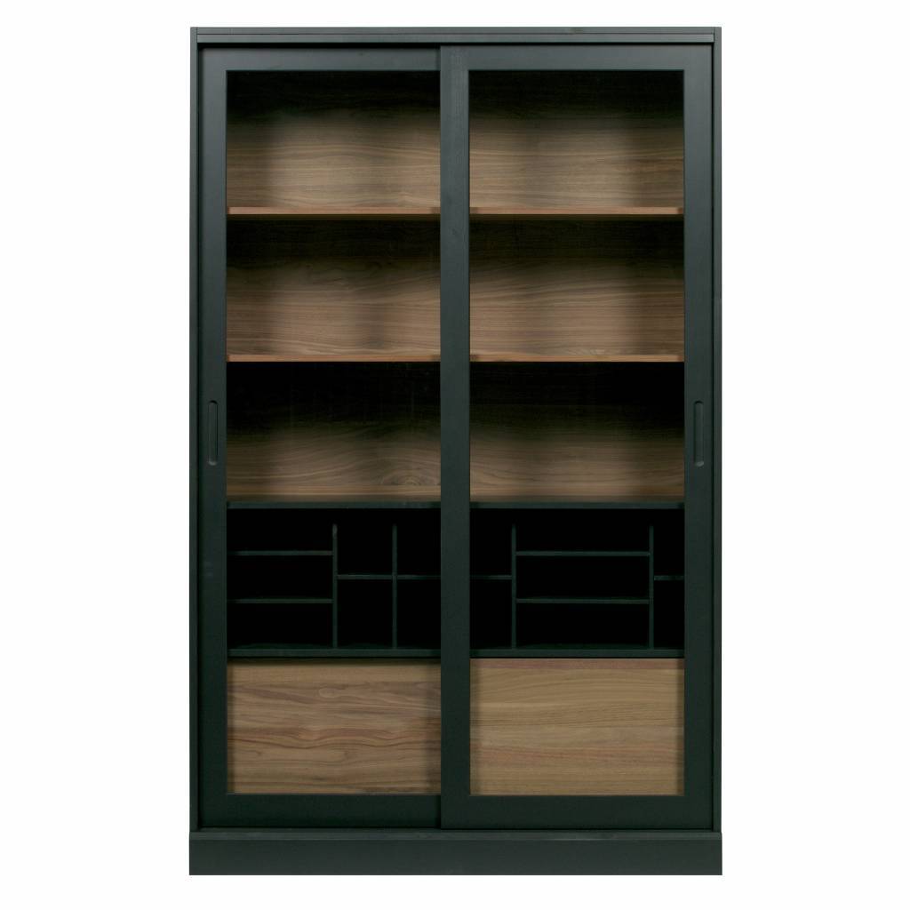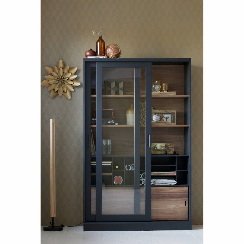 La vitrina de James tiene un hermoso estilo campestre con un borde resistente y está hecha de madera FSC. Él salpicó en un color negro. Las partes negras están hechas de madera de pino y las partes en apariencia de madera están hechas de roble (MDF, sin tratar). El interior del mueble aún conserva el color natural de la madera. La distancia entre las tablas es de 33,3 cm. Este gabinete tiene 3 estantes y estantes negros más pequeños para una gran cantidad de espacio de almacenamiento. Presenta tu vajilla o vaso favorito y úsalo con hermosos accesorios. Este gabinete se suministra como un kit con un manual de instalación claro.