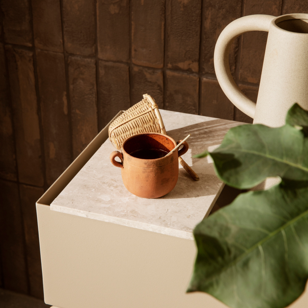 Vous pouvez mettre cette feuille sur la Plant Box de Ferm Living. Il a l'air super cool et élégant grâce à son aspect marbre. C'est une excellente façon de mettre un joli vase à fleurs ou quelques bougies aussi ! weitere Informationen...