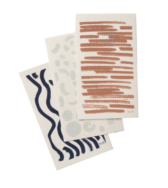 Cet ensemble de trois lingettes pratiques imprimées avec des lignes ondulées noires, des lignes droites et blanches de couleur terre cuite traçages et se compose d'un mélange ultra-absorbante de cellulose et de coton naturel. weitere Informationen...