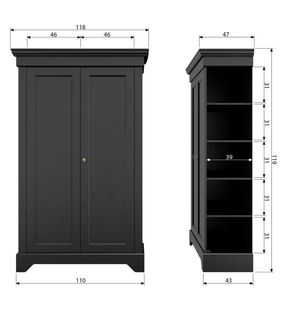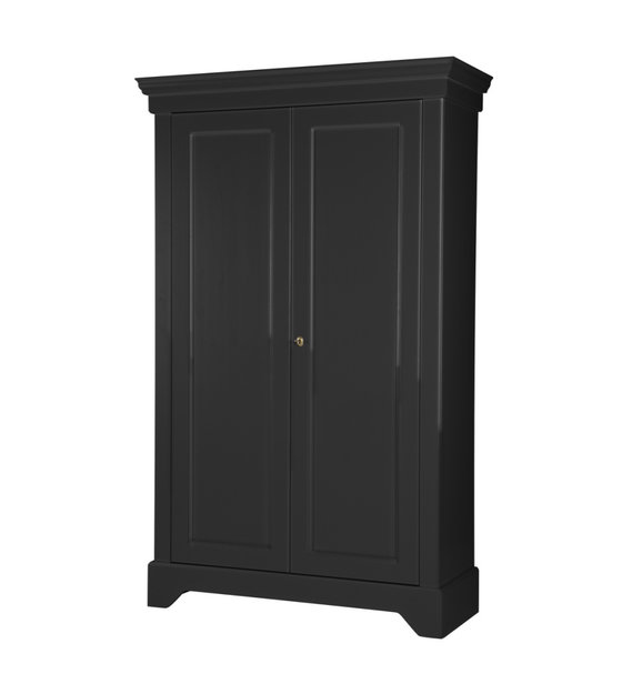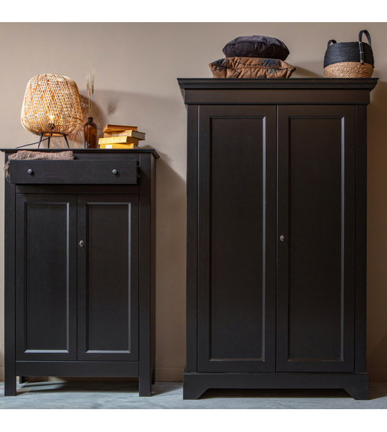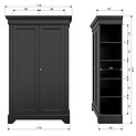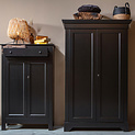 L'armoire Isabel est intemporelle et convient à tous les intérieurs. Le meuble est en pin noir massif. L'intérieur de l'armoire se compose de 4 étagères. Les portes sont équipées de charnières métalliques et d'une serrure à clé. weitere Informationen...