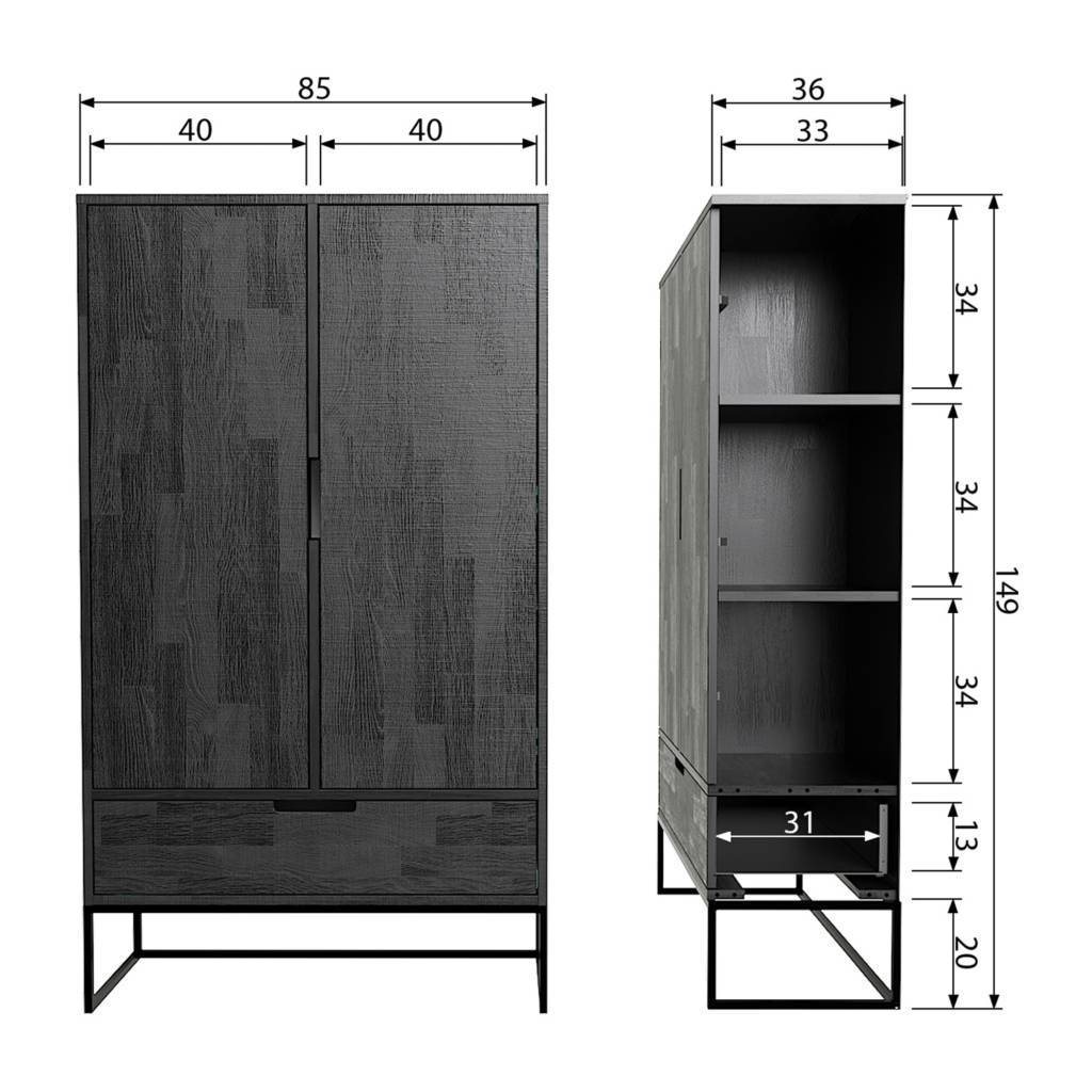 La penderie à 2 portes Silas a une hauteur de 149 cm, une largeur de 85 cm et une profondeur de 35,5 cm. Le grand tiroir ci-dessous a une profondeur de 31 cm et une hauteur de 13 cm. Le meuble a 2 portes, derrière lesquelles se trouvent 2 tablettes sur toute la largeur du meuble et la cloison a une encoche pour que vous puissiez ouvrir les portes.