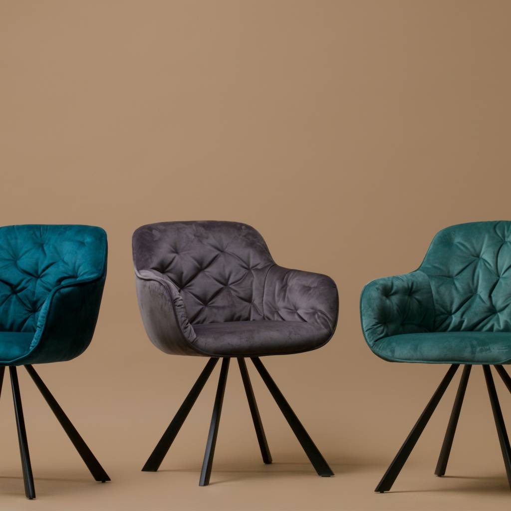 La sedia da pranzo Elaine è disponibile nei colori antracite, mare profondo e oceano. C'è anche una poltrona Elaine disponibile. La poltrona è disponibile solo con il tessuto in velluto nel colore antracite.