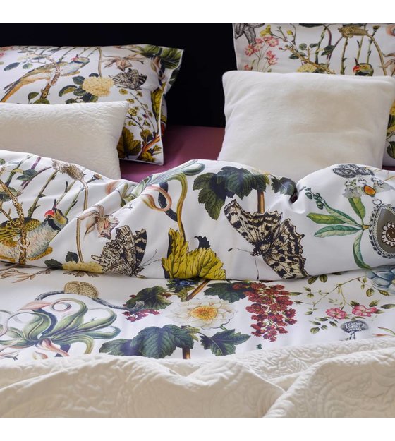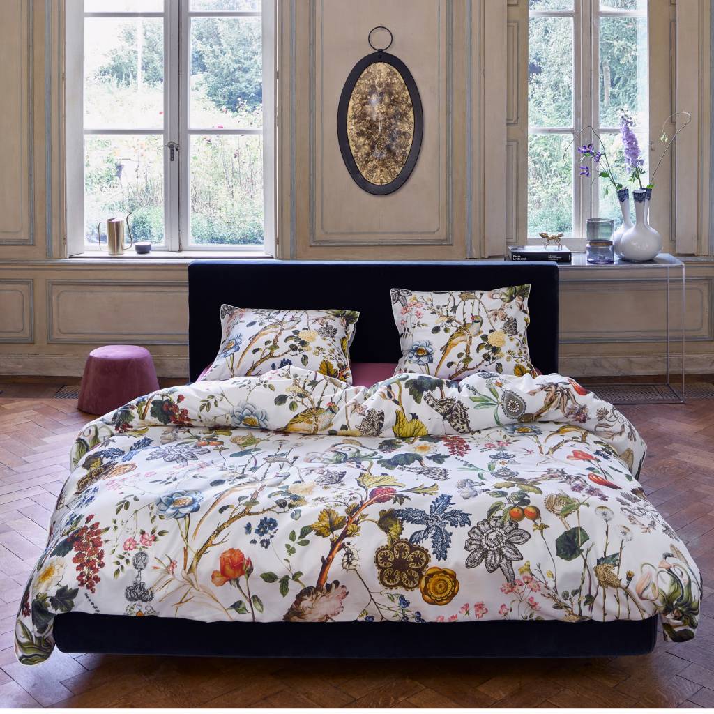 Questo copripiumino Xess di Essenza sembra provenire da una fiaba. I tanti fiori, la zucca, l'uccello e persino un gioiello ti fanno dormire come un principe o una principessa. Le tubazioni in bronzo li completano. weitere Informationen...